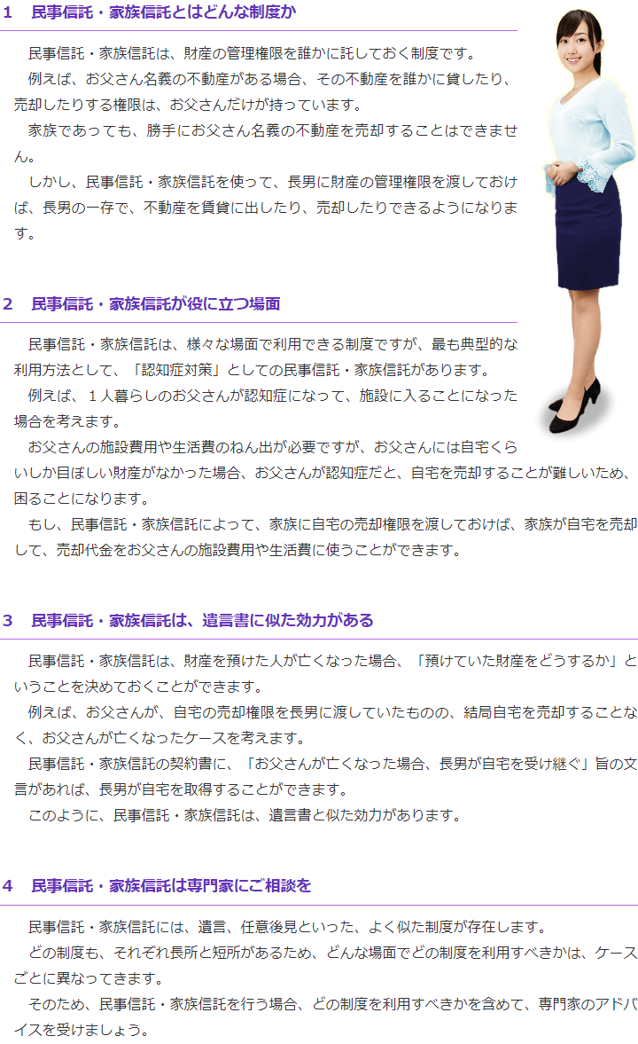 あらかじめ父親と息子で信託契約を結んでおけば、将来父親が認知症になって施設に入所することになった際にも、息子が父親の預貯金を入所費用に充てたり、父親が住まなくなった家を売却したりすることができるようになります。